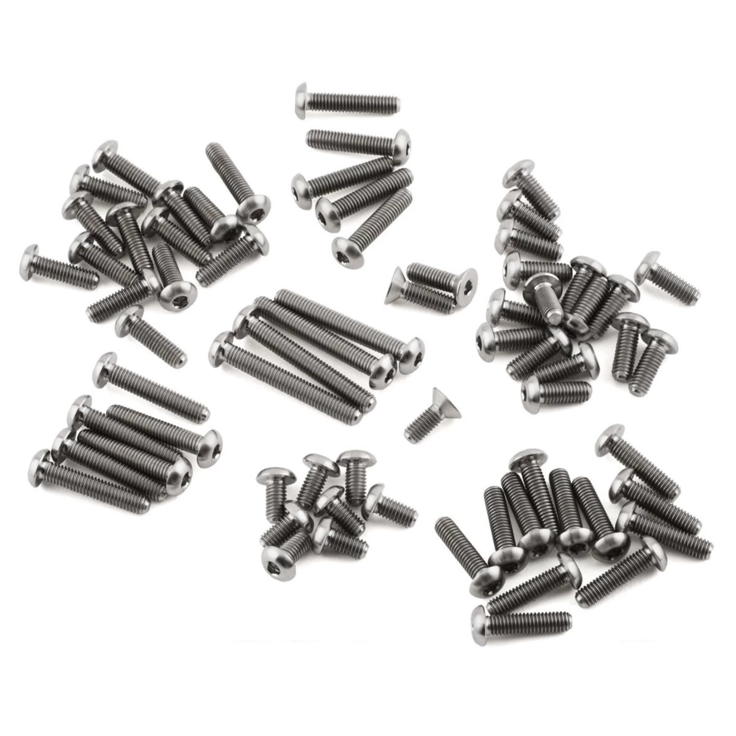 The ProTek R/C AE B74.2 and B74.2D Grade 5 Titanium Screw Kit is a 70 piece upgrade that includes the screws needed to replace the stock hardware in the upper half of the chassis. These titanium screws are CNC machined and thread rolled to near-exact tolerances from high-quality 6AL-4V (Grade 5) titanium alloy material and polished to a brilliant finish.