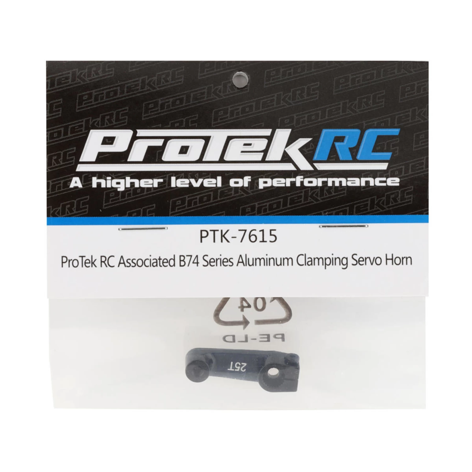 The ProTek R/C Associated B74 series Aluminum Clamping Servo Horn. This horn is machined from a solid block of aluminum alloy and anodized black. The horn has been machined to the exact specifications of the plastic Team Associated ASC92247 servo horn, but provides the precision, rigidity and durability required for the latest generation of high-performance R/C vehicles. Plus, the horn only weighs two grams and provides the security of a clamping design, ensuring the horn remains in place if the retainer screw comes loose.
