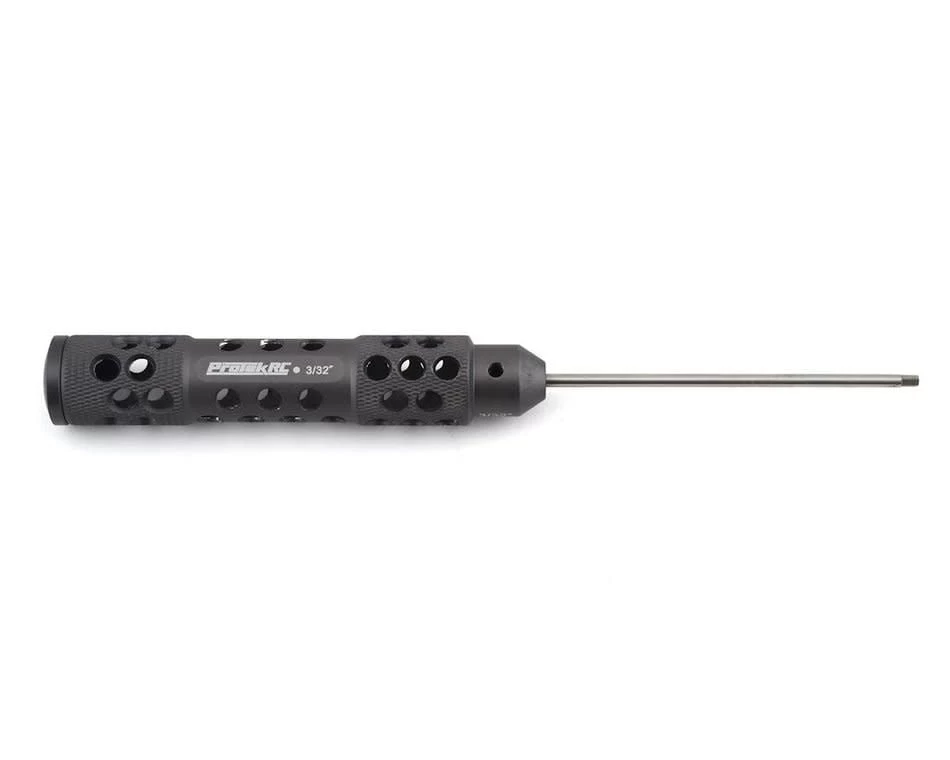 The ProTek R/C “TruTorque” 3/32″ Standard Hex Driver features a large 20mm diameter handle with machined relief holes and cross hatch knurling to reduce weight and provide a high grip surface. The end of the handle features a rotating end cap that allows the tool to spin in your palm, maximizing comfort during long wrench sessions. Plus, the tip size is laser etched in not one – but the THREE different spots on the handle to help simplify identification.