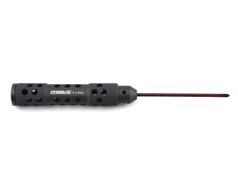 ProTek R/C “TruTorque” 3mm Phillips Head Screwdrivers feature a large 20mm diameter handle with machined relief holes and cross hatch knurling to reduce weight and provide a high grip surface. The end of the handle features a rotating end cap that allows the tool to spin in your palm, helping to minimize discomfort during long wrench sessions. Plus, the tip size is laser etched in not one – but the THREE different spots on the handle to help simplify identification.